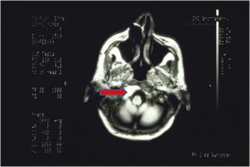 La risonanza magnetica dell’encefalo evidenzia una lesione neoplastica del tronco encefalico (neurinoma) con coinvolgimento della regione del forame occipitale.
